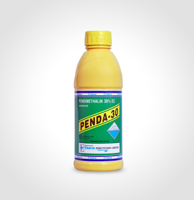 Penda-30 is an eco-friendly, pre-emergence selective herbicide based on pendimethalin technical. It is applied to the soil before the crop emerges and prevent the germination or early growth of weed seeds like Echinochloa spp., Euphorbia spp, Amaranthus sp and Portulaca sp in Soybean, Rice & Cotton; Phalaris minor & Chenopodium album in Wheat, which are not controlled by commonly used weedicides.